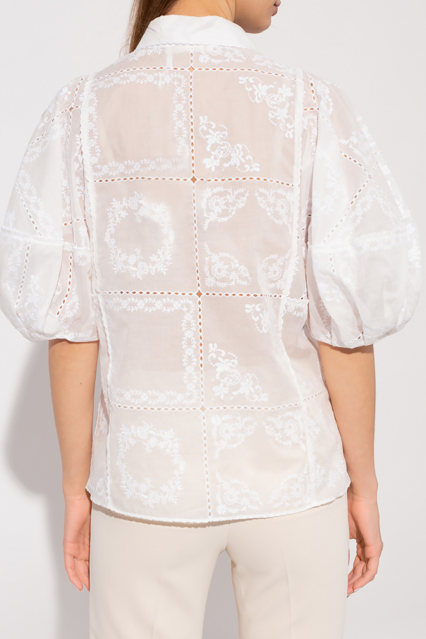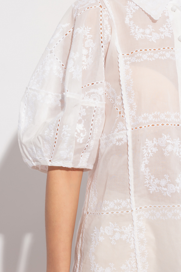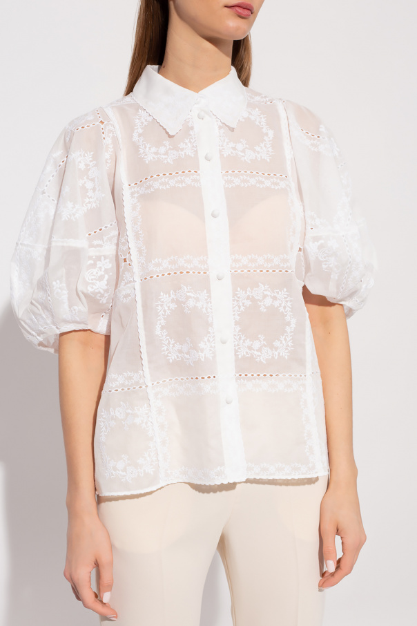 White shirt from Chloé. Made of cotton, this style showcases an openwork pattern and floral embroidery. It is complete with button fastenings and short puff sleeves.