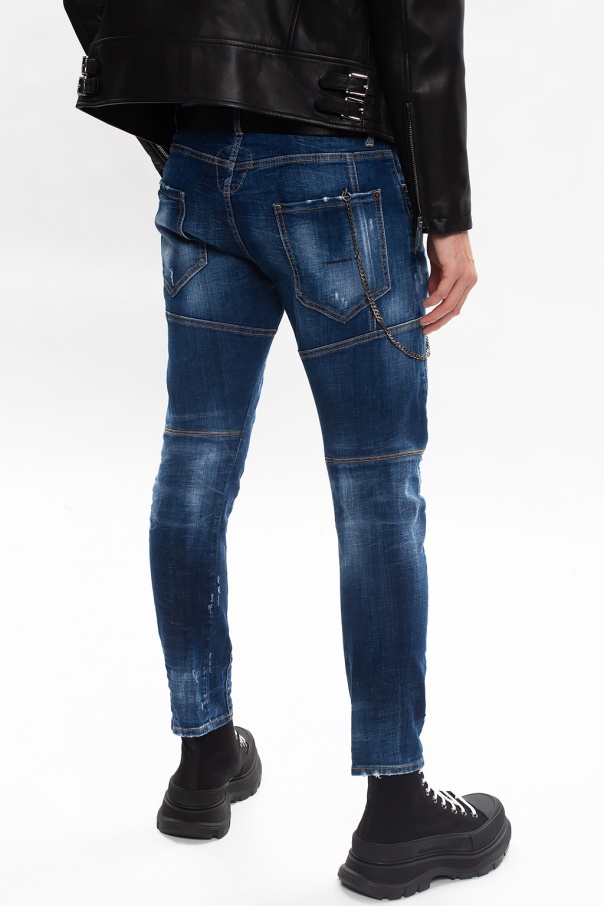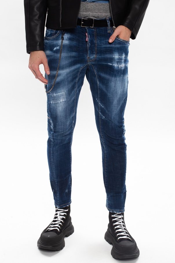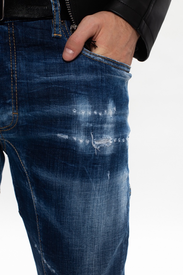 Navy blue ‘Twin Pack Straight Leg Jean’ jeans from Dsquared2. Emblazoned with distressed effects and printed logo in black, this pair falls down with tapered legs and features a button fastening, classic five pockets and an elasticated waistband with drawcords.