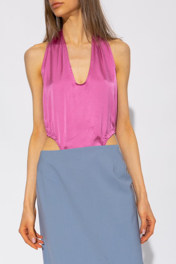 Pink satin bodysuit from Jacquemus. Crafted from FSC® certified material, this style features a plunging neckline, a denuded back, double fine strap closures on the bodice, snap fastenings at the bottom, and high slits on the sides.