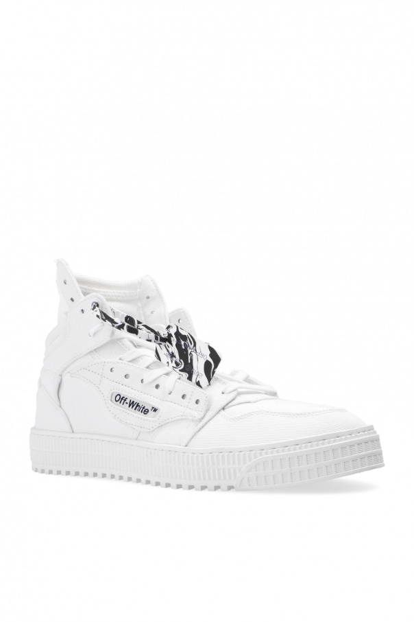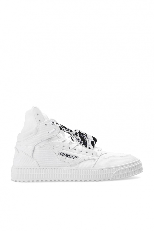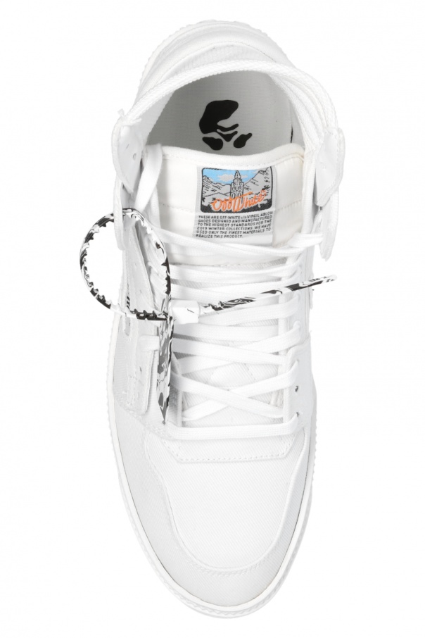 White ‘3.0 Off Court Vintage’ high-top sneakers from Off-White. Embroidered with the brand's logo, this lace-up pair sits on a white rubber sole and boasts the brand's signature zip tie tag in black and white.