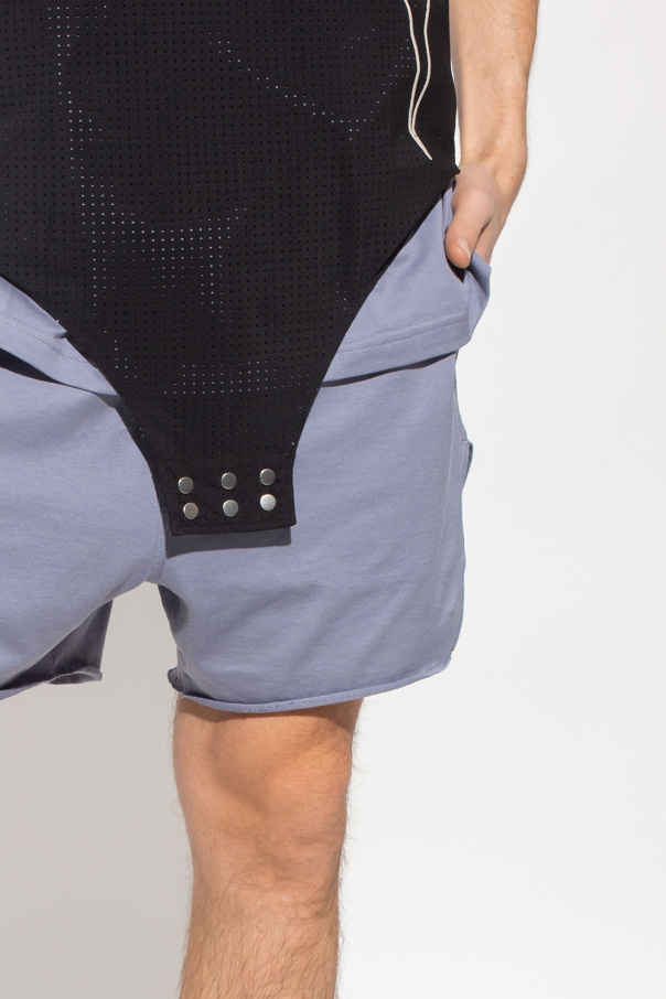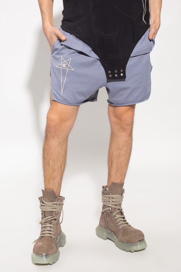 Blueish grey shorts from Rick Owens x Champion. Made of cotton, this pair features a drawstring waistband, two slip pockets, logo embroidery and hem splits.