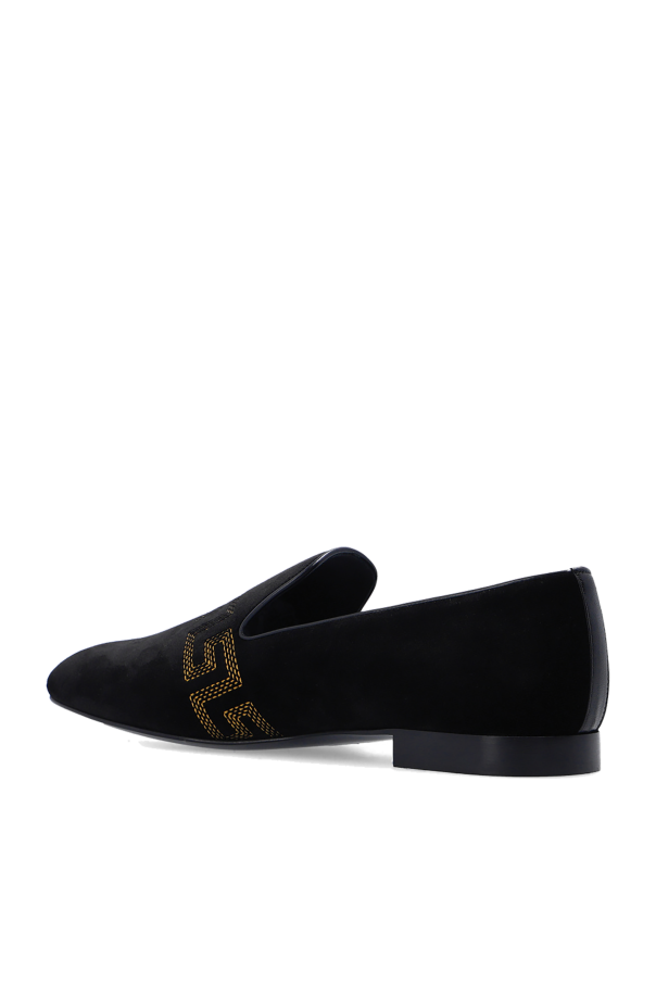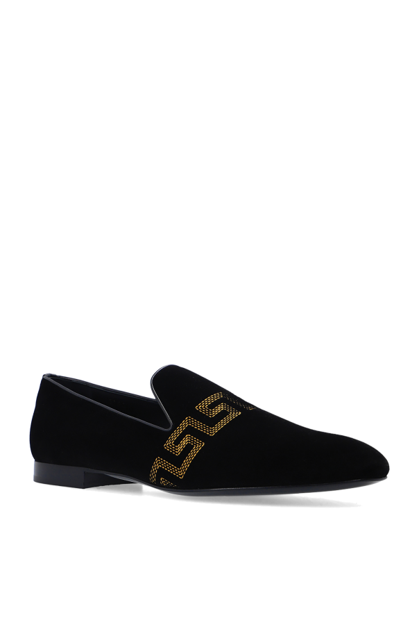 Black ‘Greca’ loafers from Versace. Resting on a black leather sole, this pair is enriched by the label’s signature embroidered La Greca pattern in beige.