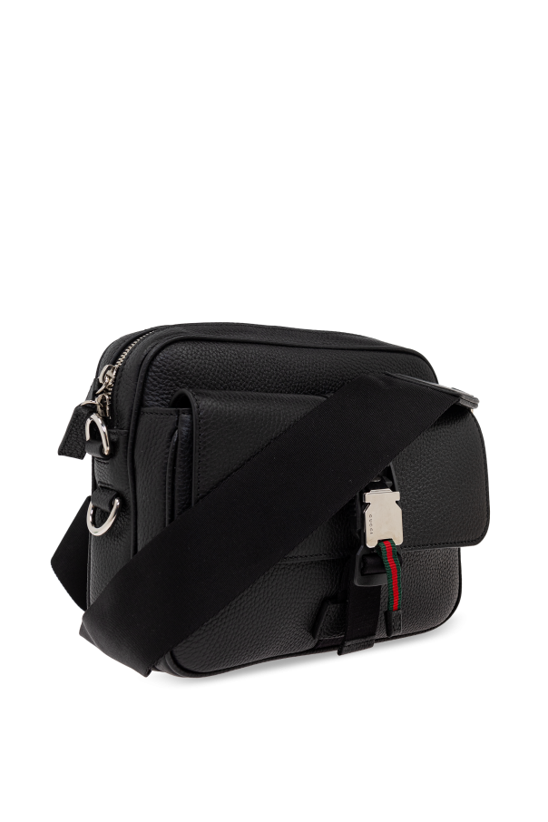 Introducing the Gucci Shoulder Bag, a paragon of elegance and modernity. This exquisite accessory boasts a rectangular silhouette with gently rounded edges, epitomizing minimalist sophistication. Crafted from the finest black leather with a subtle texture, it exudes timeless allure. The bag\'s design features a broad, adjustable shoulder strap in matching black, complemented by a front metal clasp engraved with the designer\'s logo. Beneath this clasp, the iconic red and green stripes add a distinctive touch, hallmarking its uniqueness. Ensuring security and style, the main compartment is secured with a zipper closure. Inside, you will find a thoughtfully designed compartment and a zippered pocket, perfect for organizing essentials. Why Choose This Product? Impeccable craftsmanship by Gucci, renowned for luxury. Versatile black color for everyday and formal occasions. Distinctive design with signature red and green accents. Functional interior with multiple secure pockets.