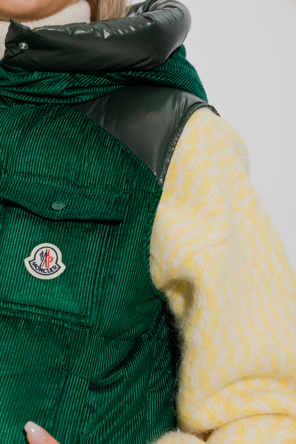 Dark green ‘Eau’ quilted corduroy vest with a hood from Moncler. Padded with natural down and feathers with the DIST certificate, this style features snap fastenings, a drawcord-adjustable hem and a flapped pocket with a felt logo patch on the front.