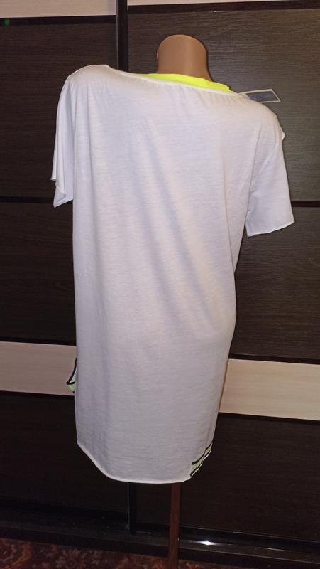 Интересная и необычная вещичка. На груди надпись. Сбоку и в низу пришита тесьма. Один рукавчик с надрезами, так как и горловина в нескольких местах. Также на груди сверху снизу от надписи украшено булавками. Выглядит очень классно. О покупке не пожалеете. Новая, остаток с магазина.