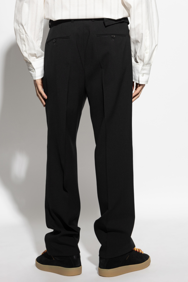 Introducing the Lanvin Classic Pleated Trousers, an epitome of timeless elegance crafted for the discerning gentleman. Designed by the esteemed house of Lanvin, the oldest French haute couture brand, these trousers embody a legacy of sophistication and refinement. Fashioned from luxurious virgin wool, these trousers feature a classic pleat with a straight leg, exuding a formal yet versatile allure. Rendered in an exquisite shade of black, they are adorned with a metal clasp closure and belt loops, seamlessly blending tradition with modernity. Complemented by two sleek back pockets and a practical zip fastening, these trousers speak to the brand\'s commitment to impeccable craftsmanship and innovative design. Perfect for both business and elegant occasions, they are an essential addition to any sophisticated wardrobe. Why Choose This Product? Crafted by the revered Lanvin, synonymous with luxury and style. Made from premium virgin wool for ultimate comfort and durability. Features a sleek pleated design with modern metal detailing. Equipped with functional pockets for added practicality.