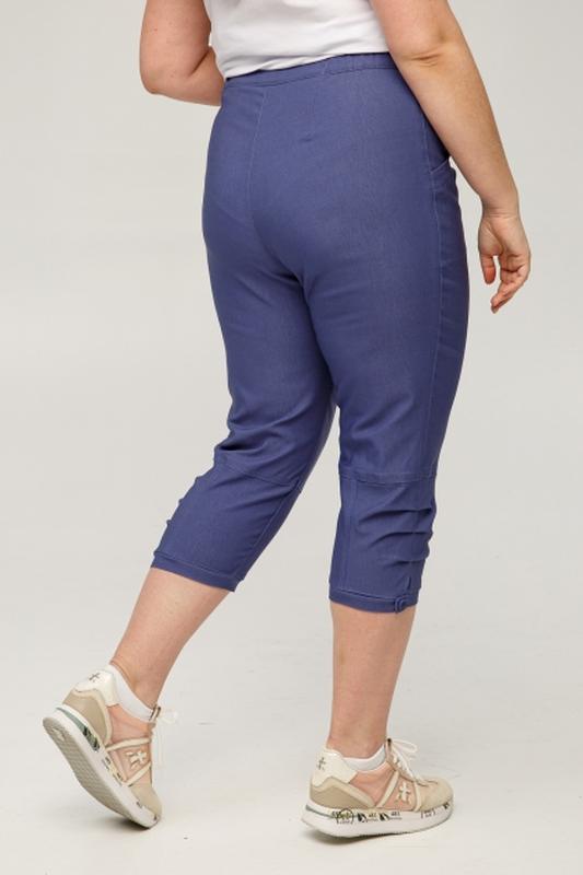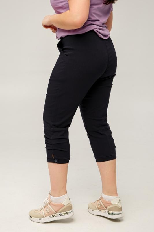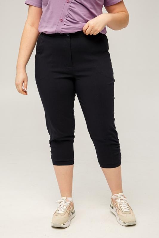 Капри прямого силуэта, выполненные из ткани бенгалин стрейч. Ткань практичная и удобная, хорошо тянется и садится по фигуре, удачное решение для изделий на каждый день. По низу выполнена сборка и манжеты с застежкой на пуговицы, по бокам карманы. В поясе присутствуют вставки на резинке (макс. растяжимость до 10 см). Классическая застежка на молнию и пуговицу.