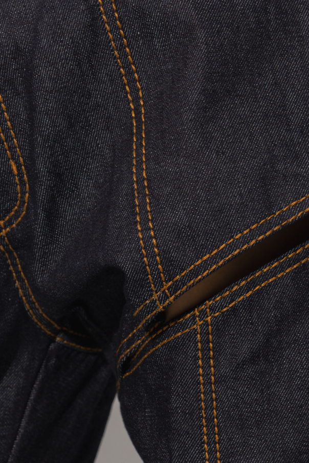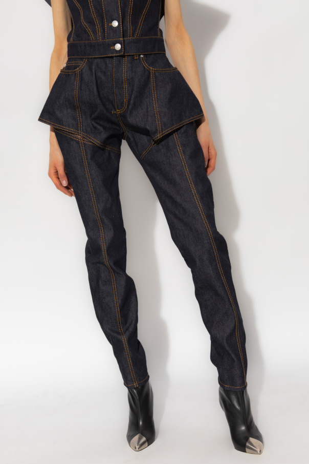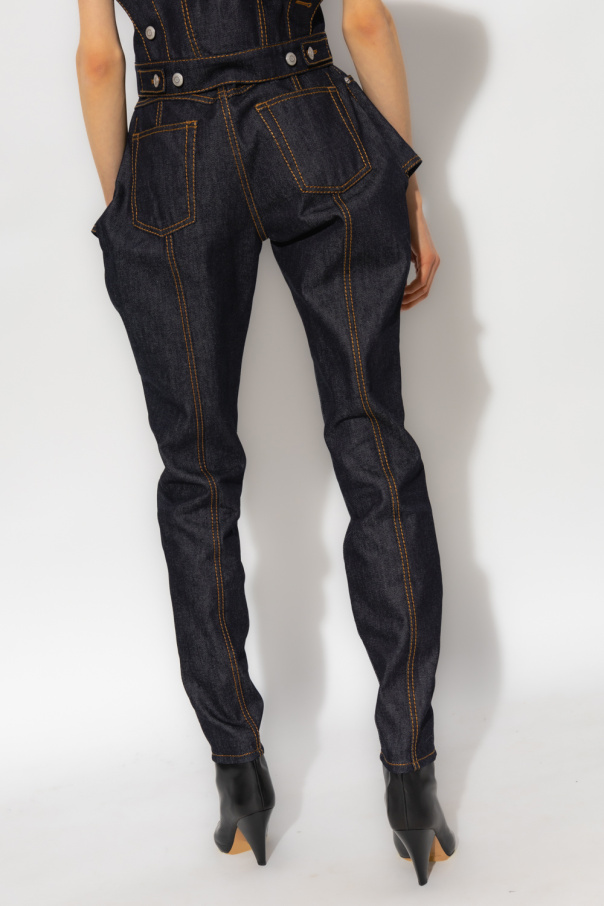 Navy blue high-rise jeans from Alexander McQueen. Embellished with contrasting stitching details and decorative cutouts, this pair falls with slim-fit legs and features a zip fly with a button, classic five pockets and a back logo patch.
