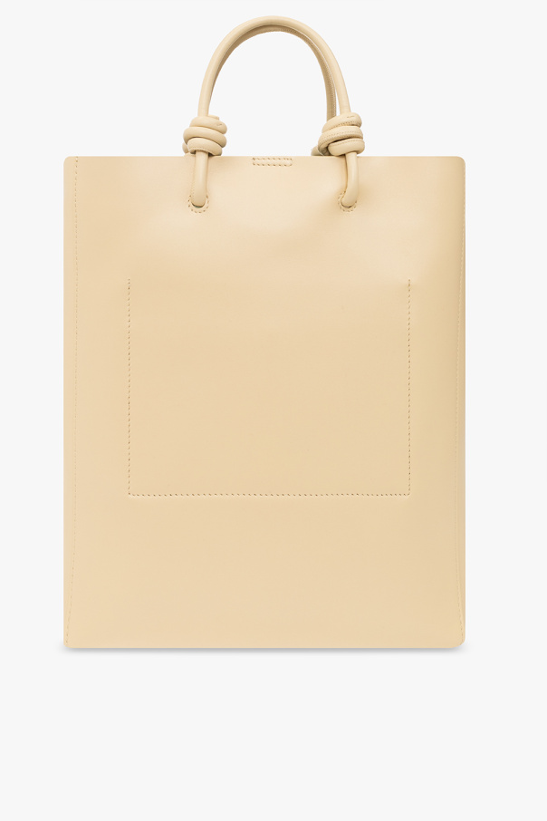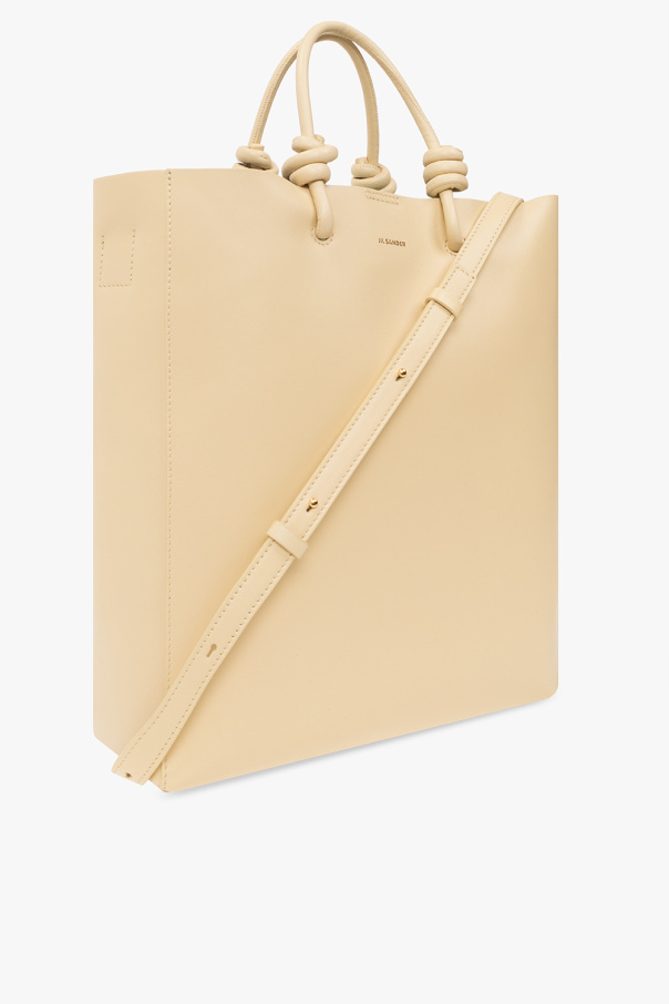 Yellow shoulder bag from Jil Sander. Crafted from calf leather, this model is complete with a gold-tone logo print, two half-round handles with decorative knots, detachable and adjustable shoulder strap, gold-tone metal hardware and one internal compartment with one slip pocket and two card slots.