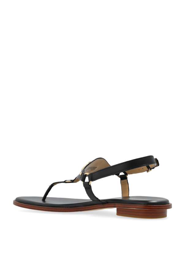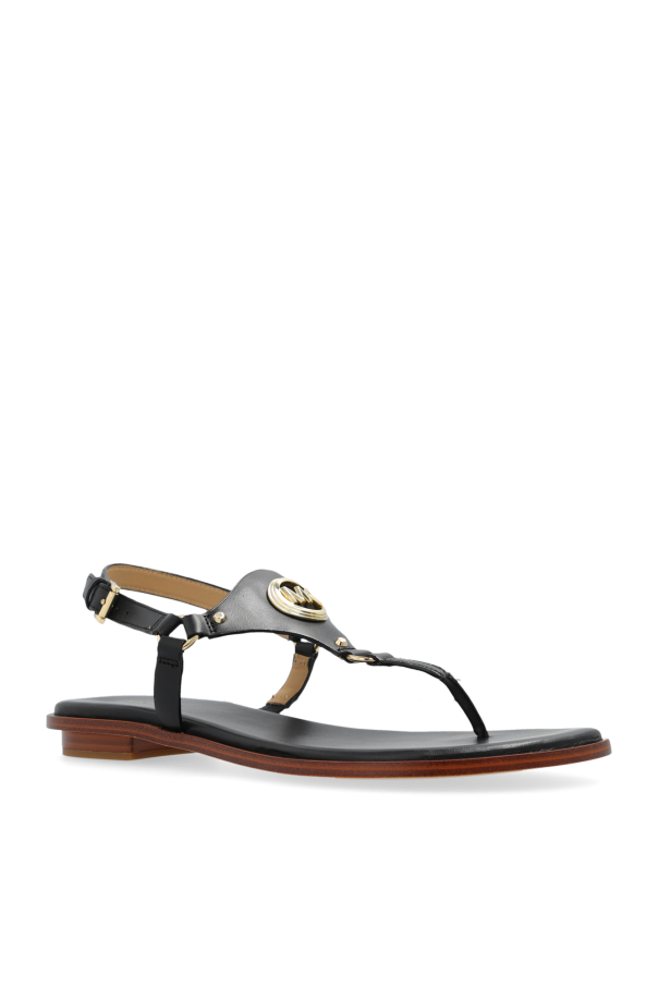 Introducing a pair of black leather sandals from the exclusive collection by Michael Michael Kors, designed to encapsulate elegance with a minimalist design ethos. Crafted with an outer and inner layer of premium leather, these sandals promise not only a sleek aesthetic but also durability and comfort for the wearer. The flat sole, accented with a contrasting brown trim, adds a subtle touch of sophistication, complementing the black hue of the upper. The sandals feature a series of straps, including a main strap adorned with an ornamental metal circle showcasing the designer\'s logo, and a thin strap creating a loop around the toe. An additional strap wraps around the ankle, equipped with a buckle closure for adjustable fit and enhanced support. The intricate details, such as the designer logo and metal accents, elevate the sandals to a must-have accessory for those seeking a refined yet versatile addition to their summer wardrobe. Why Purchase This Product? Exclusive Design: Part of an exquisite collection by Michael Michael Kors, ensuring a unique style statement. High-Quality Materials: Crafted with premium leather for both comfort and longevity. Sophisticated Details: Embellished with the designer\'s logo and metal accents for an elegant touch. Versatile Accessory: Perfect for complementing a wide range of summer outfits, from casual to formal.