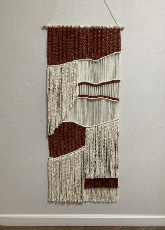 Панно макраме гобелен з яскравими кольоровими деталями, поєднання плетених елементів та бахроми. Довжина основи 60 см, панно 55* 120 см. Кольори - айворі та цегляний. Колір може бути змінений за вашим бажанням. Можливе виготовлення панно в інших розмірах.
