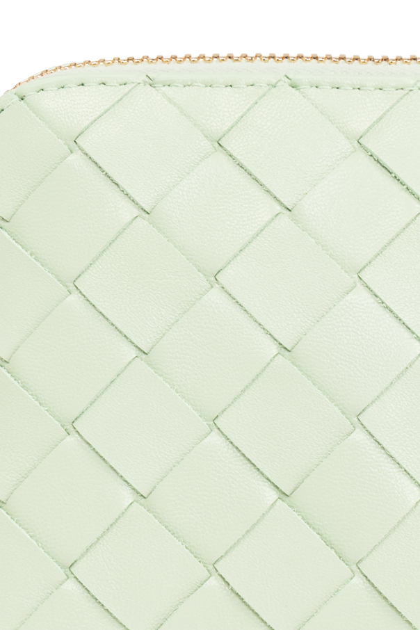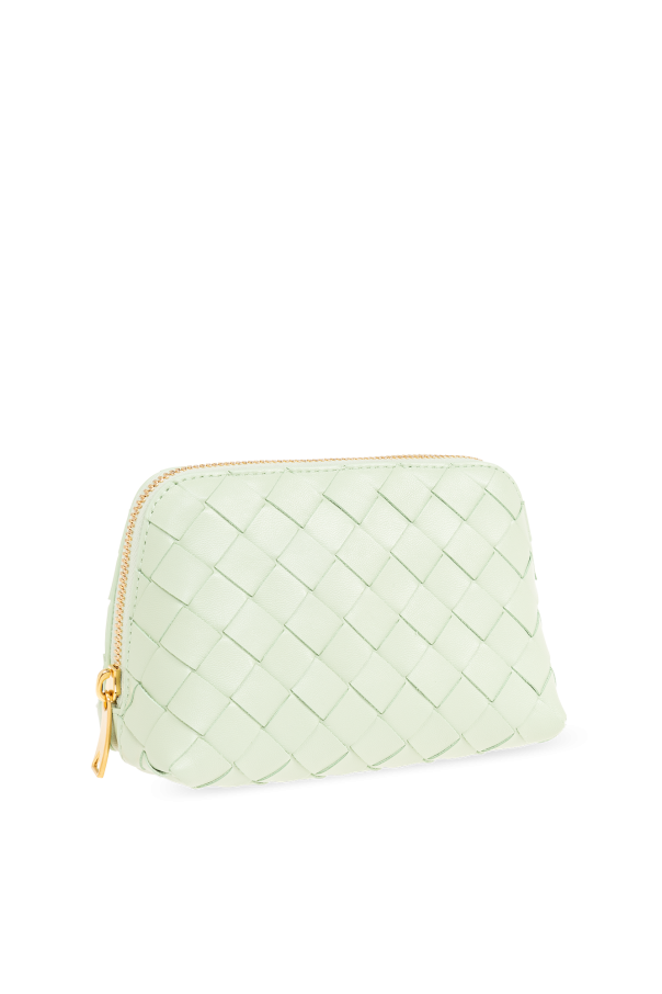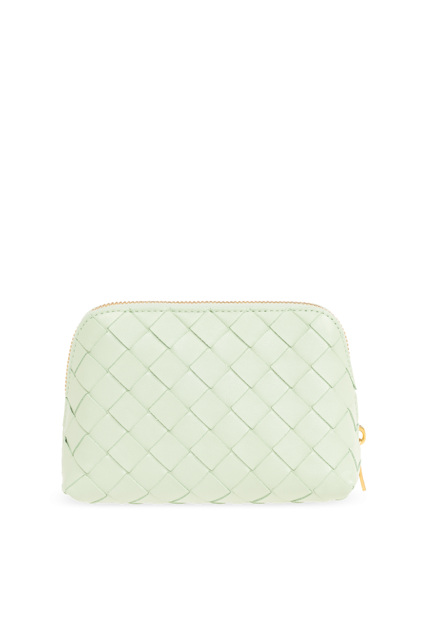 Light green wash bag from Bottega Veneta. Made of lamb leather with the iconic Intrecciato weave, this model features a zip fastening, gold-tone metal hardware and one internal compartment with one slip pocket.
