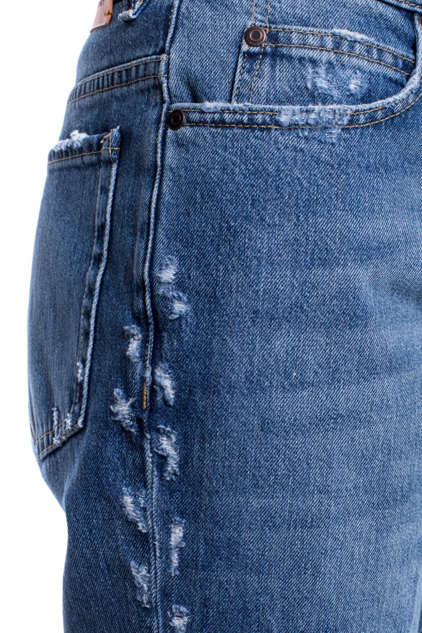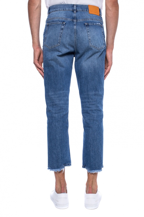 Light blue stonewashed jeans from Stella McCartney. Fastened with zip and button. Enriched by orange patch with embossed logo at rear. 5-pocket design. Tapered legs feature raw edge finishing. Copper-coloured metal hardware.