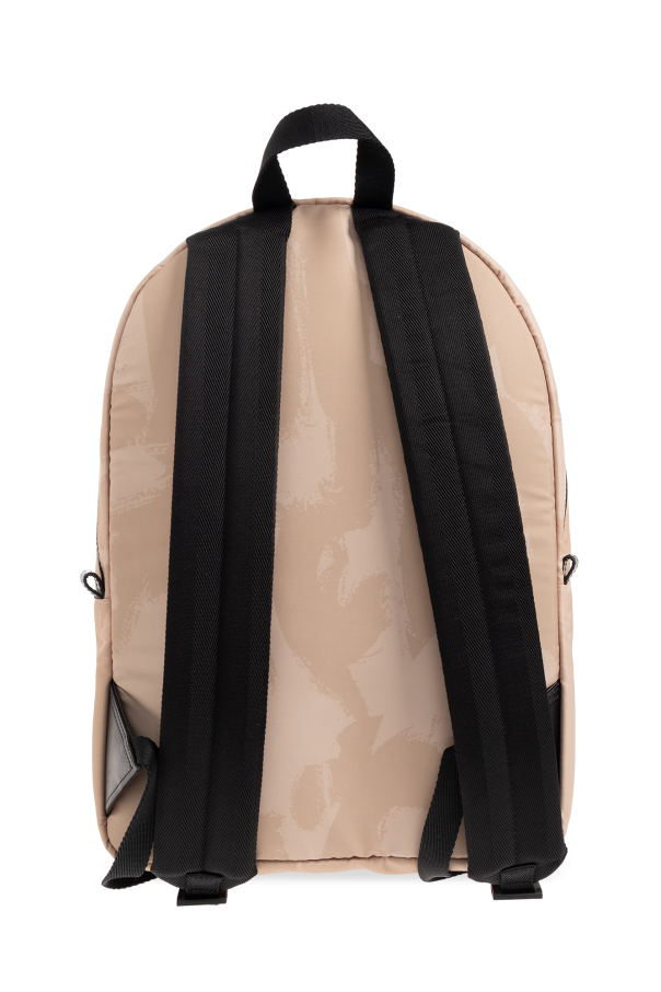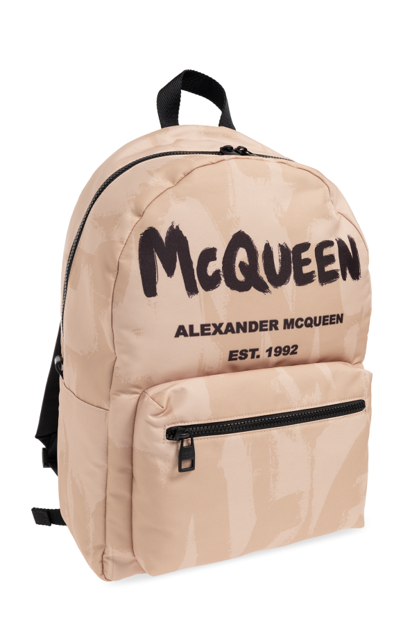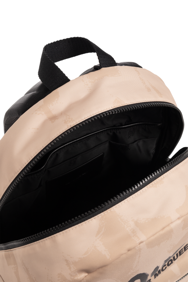 Beige ‘Metropolitan’ backpack from Alexander McQueen. Made of technical fabric with calf leather trims, this design fastens with a two-way zip and is decorated with a monogram pattern and a black logo print. It is complete with a zipped front pocket, top handle, adjustable shoulder straps, silver-tone metal hardware and one internal compartment with two slip pockets and one card slot.