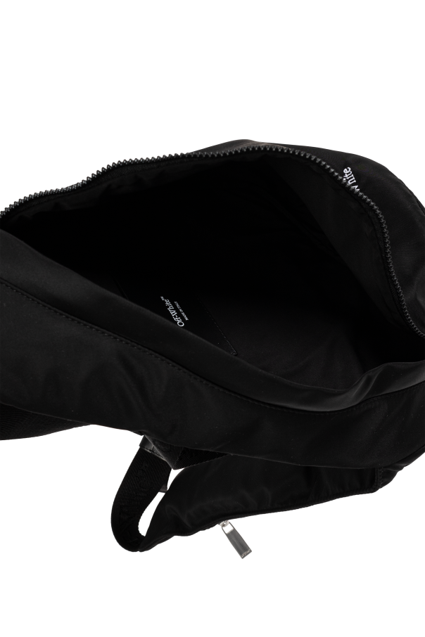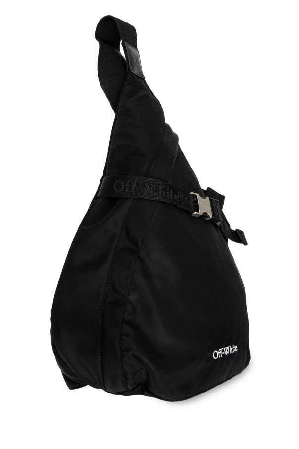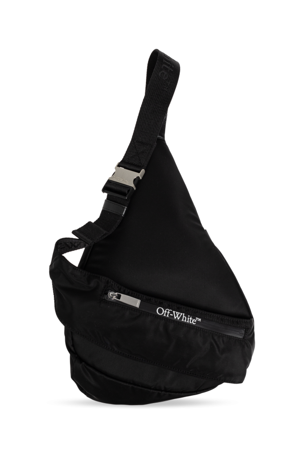 Experience the epitome of modern elegance with the Off-White Logo Backpack. This exclusive piece from the renowned Off-White brand showcases a distinctive asymmetrical, triangular shape, complemented by a single wide shoulder strap. Its minimalist and contemporary design is unmistakably Off-White, making a bold yet sophisticated statement. Crafted from resilient black material with a smooth, matte finish, this backpack is both durable and water-resistant. The front is adorned with a subtle, centrally-placed white \"Off-White\" logo, and additional branding is discreetly positioned on the strap and zipper, adding an understated touch of luxury. The backpack features a robust metal zipper as the primary closure mechanism, ensuring your belongings are secure. The adjustable strap with a metal buckle allows for a customized fit, enhancing the practicality of this stylish accessory. Inside, the spacious main compartment, lined with black fabric, includes a slip pocket for added functionality without compromising the sleek interior design. Why Choose This Product? Exquisite Design: Asymmetrical, triangular shape with minimalist aesthetics. Premium Materials: Crafted from durable, water-resistant black material with a smooth, matte finish. Distinctive Branding: Subtle \"Off-White\" logos on the front, strap, and zipper. Functional Features: Spacious interior with a slip pocket, secure metal zipper, and adjustable strap. Exclusive Appeal: Represents the contemporary and influential style of the Off-White brand.