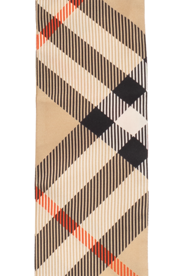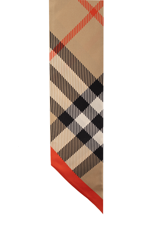 Beige, red and black neckerchief from Burberry. Made of silk, this item showcases the brand\'s signature ‘Burberry Check’ pattern and tapered edges.