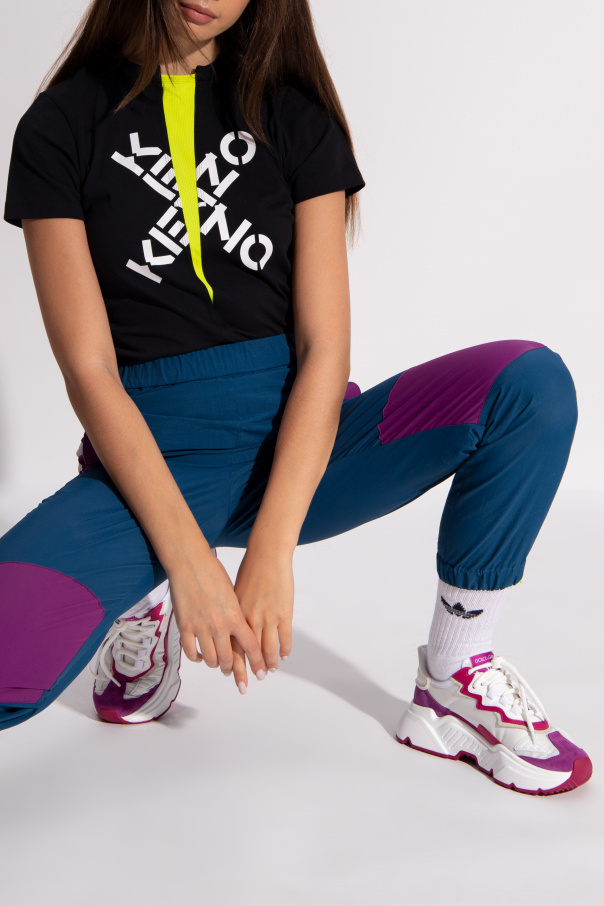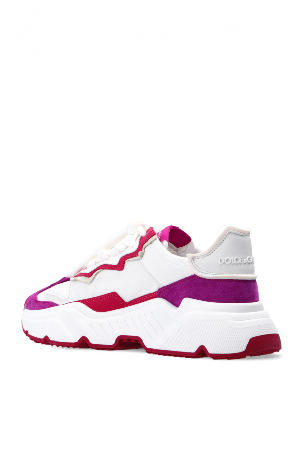 White, pink and purple sneakers from Dolce & Gabbana. Crafted from leather and fabric, this lace-up model sits on a white rubber sole and showcases a logo patch.