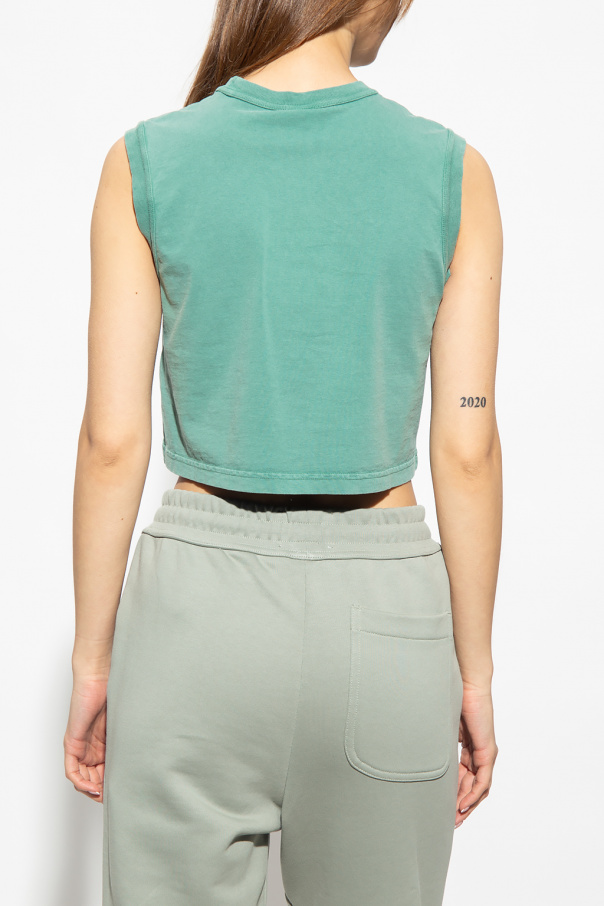 Green sleeveless T-shirt from T by Alexander Wang. Made of cotton, this design features a ribbed crew neck and printed logo pattern in green.