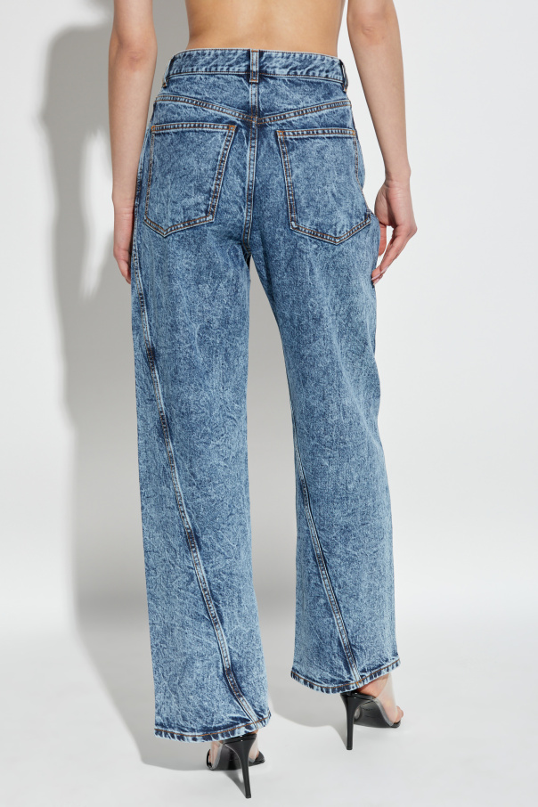 Introducing the High-Waisted Jeans from the illustrious designer Alaïa, a name synonymous with exquisite craftsmanship and unparalleled design. These jeans are a quintessential addition to the discerning wardrobe, crafted to perfection in a captivating shade of blue. Fashioned from premium denim, these jeans embrace the classic texture of non-stretch cotton, accentuated by a chic distressed finish. The boyfriend silhouette offers a relaxed fit, with wide legs that exude a laid-back charm, perfect for understated elegance. Attention to detail is paramount, with a traditional zipper and button closure, complemented by five pockets, including a charming coin pocket. The contrasting stitching not only enhances the structural integrity but also adds a touch of sophistication. Why Choose This Product? Expertly crafted from 100% cotton for timeless durability. Effortless style with a fashionable vintage appeal. Versatile design suitable for everyday ensembles. Signature Alaïa creation, blending heritage with modernity.