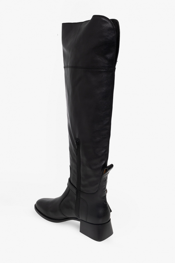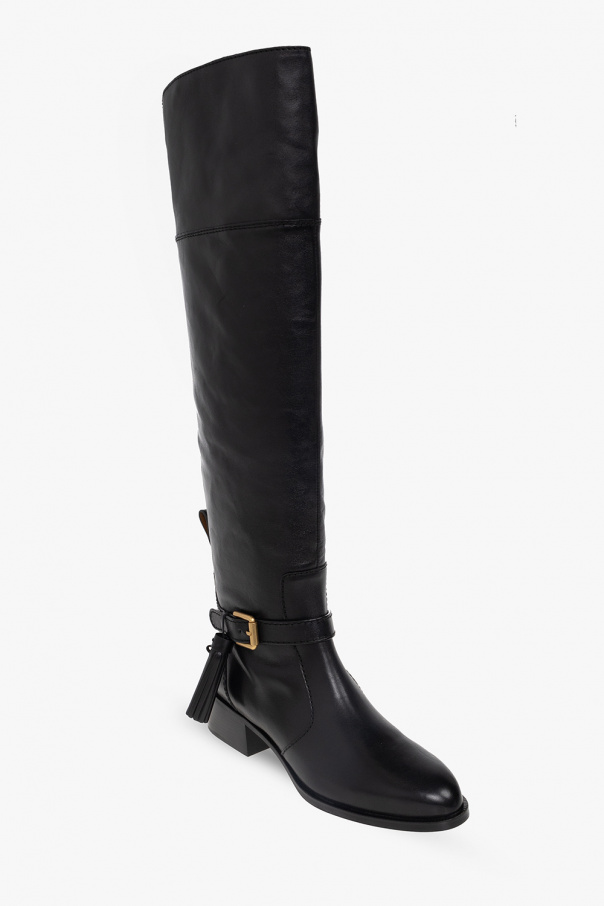 Black ‘Lory’ heeled over-the-knee boots See By Chloé. Made of leather, this pair features a side zip, buckle strap with decorative tassels and black rubber sole.