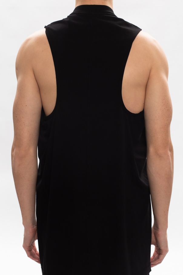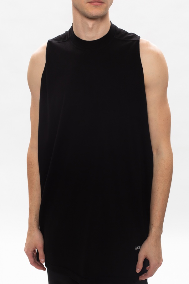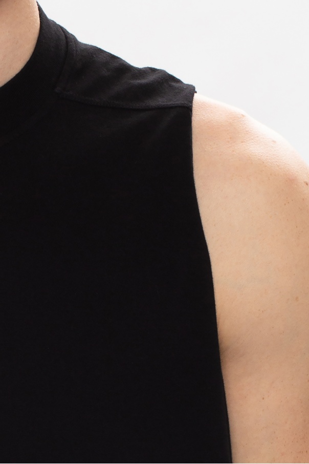 Black crewneck T-shirt from Rick Owens DRKSHDW. Cut from cotton with an oversize silhouette, this sleeveless style boasts a branded patch and a sewn-on black strap.