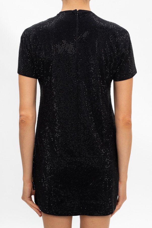 Black dress with a round neck from Philipp Plein. Crafted from cotton, this short sleeve design fastens at the back with a concealed zip and is embellished with crystals and a logo embroidery.