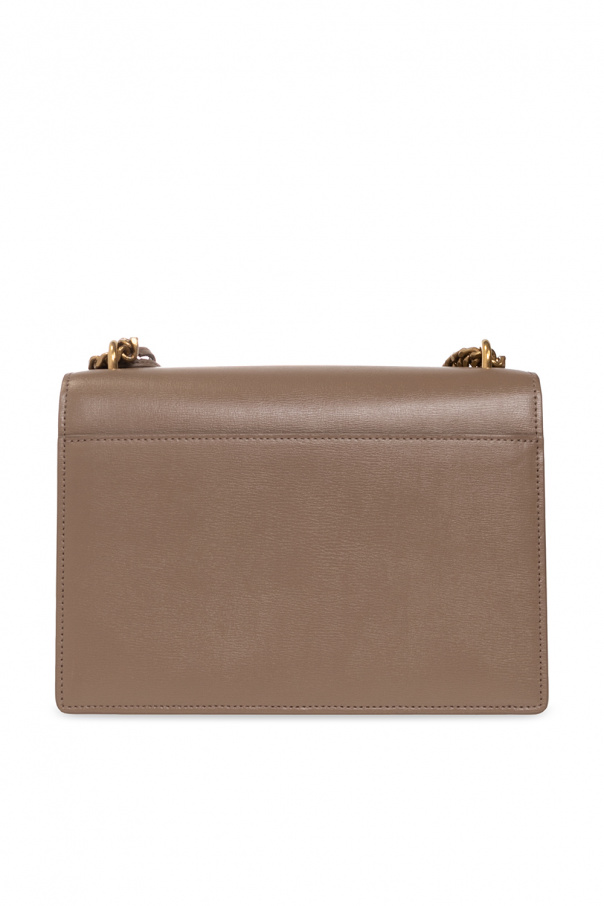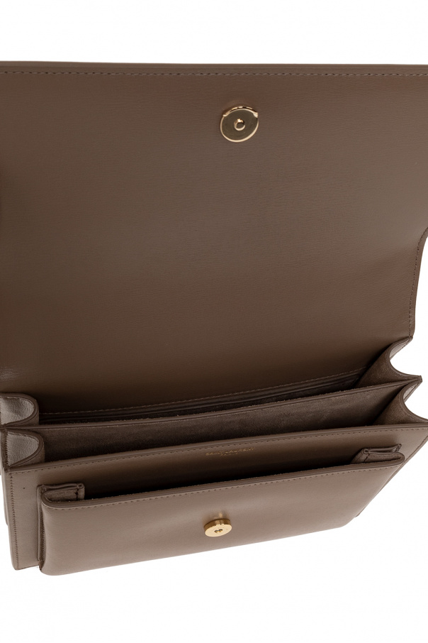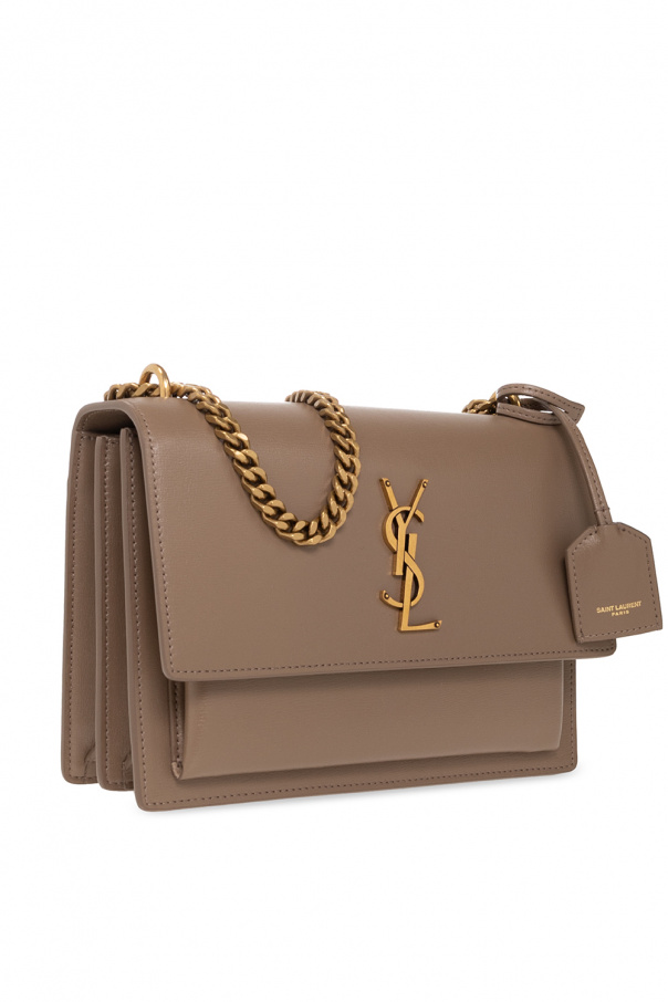 Brown ‘Sunset Medium’ shoulder bag from Saint Laurent. Made of calf leather, this design secures with a magnetic fastener and features a logo application, a back slip pocket, a chain shoulder strap, gold-tone metal hardware and an interior with two compartments and two slip pockets.