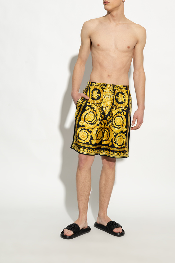 Black slides from Versace. Resting on a black rubber sole, this pair is decorated with an embossed logo.