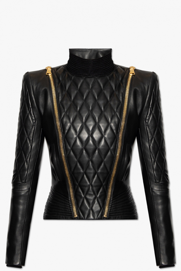 Black jacket from Balmain. Crafted from lamb leather, this style features a zip fastening, two pockets and a distinctive zipper on the front, and long sleeves with zipped cuffs.