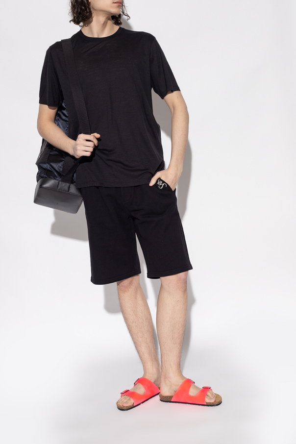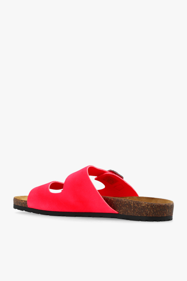 Neon pink ‘Jimmy’ slides from Saint Laurent. Made of suede, this pair features an adjustable strap with an antique silver-tone buckle and black rubber sole.