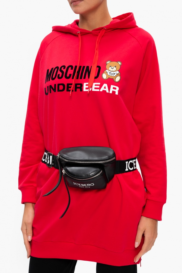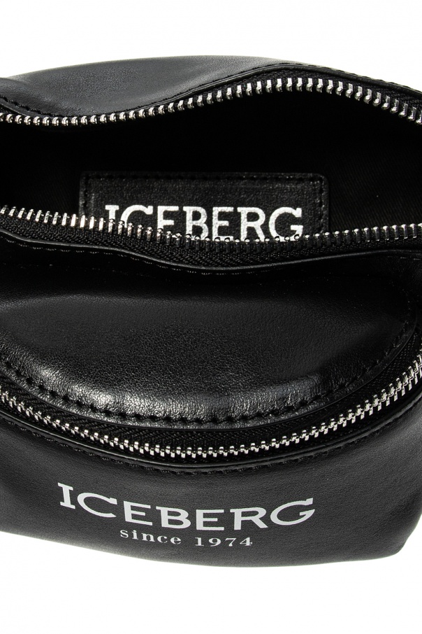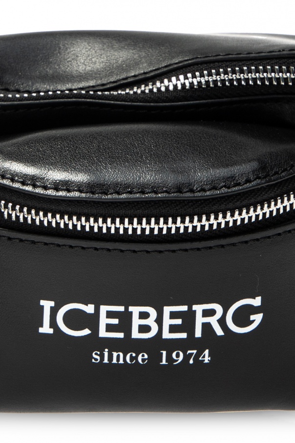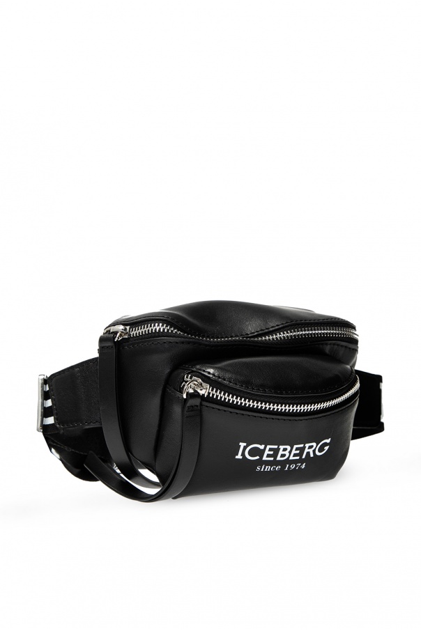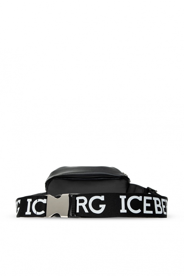 Black belt bag from Iceberg. Showcasing white graphic print with the brand's logo, this calf leather-crafted design is complete with two external zipped pockets, an adjustable strap with printed white logo, silver-tone metal hardware and interior with one compartment.