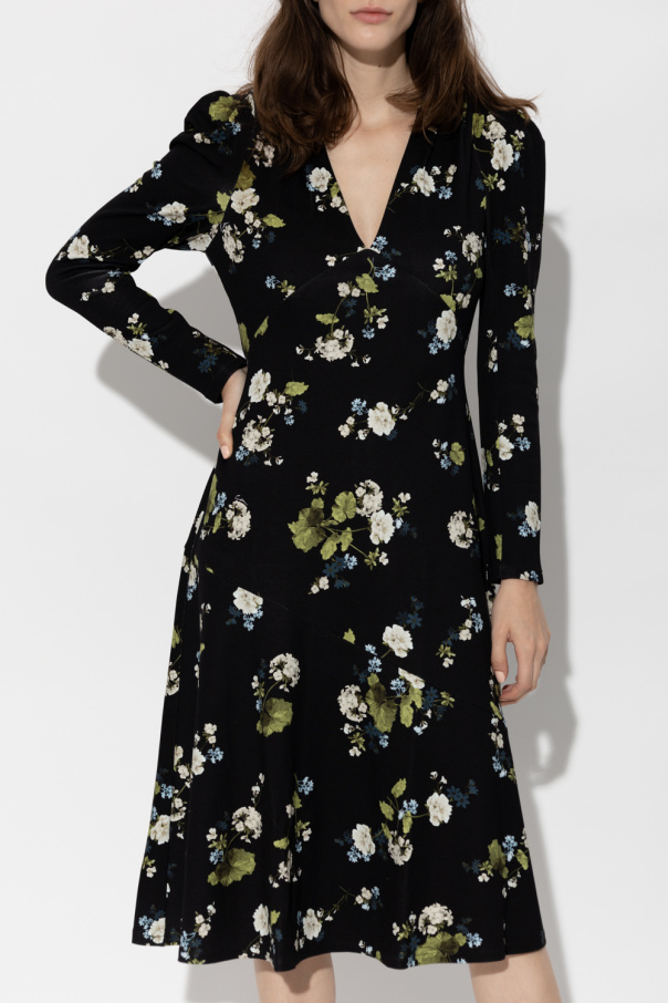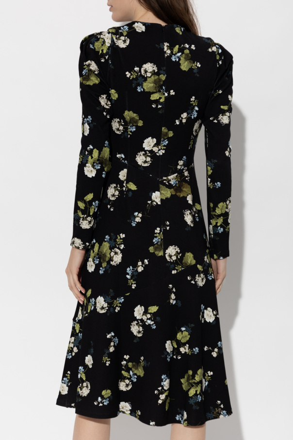 Black ‘Sophie’ dress from Erdem. Fastened with a concealed back zip, this V-neck design features a multicolored floral motif, flared silhouette and long sleeves.