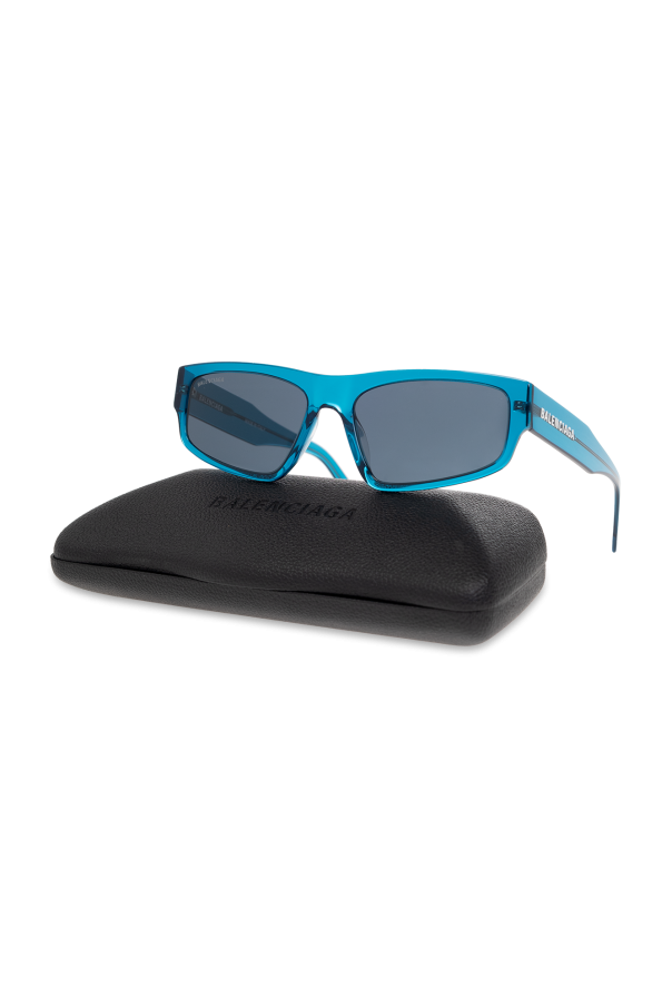Blue, transparent ‘Flat’ sunglasses from Balenciaga. This pair features a D-frame, white logo on the side and blue lenses with 100% UV protection. Case included.