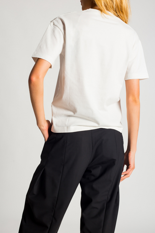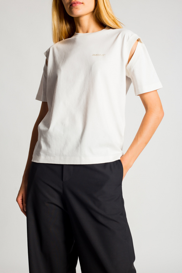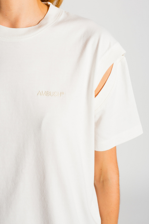 White crewneck T-shirt from Ambush. Crafted from cotton, this style features short sleeves, an elasticated collar, decorative cut-outs and white graphic embroidery with the brand\'s logo.