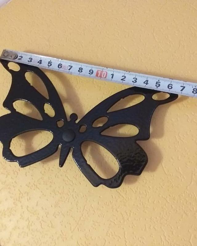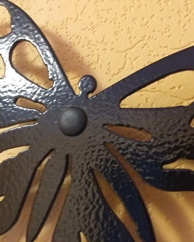 Панно на стену 2D "Бабочки" высота 10 см, ширина 17 см, высота 15 см, ширина 19 см, металл 2 мм, краска порошковая. Декор крепится с помощью шурупов с проставками на расстоянии 15 мм от стены.