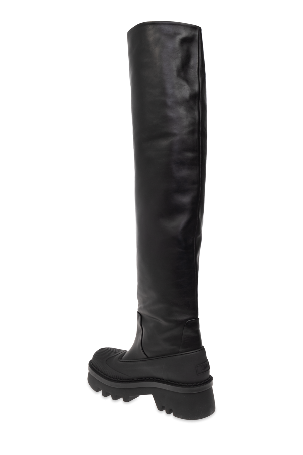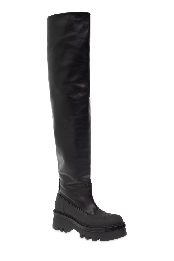 Black platform boots from Chloe. Crafted from leather, this almond toe pair sits on a black rubber sole and features a logo embellishment to the back.