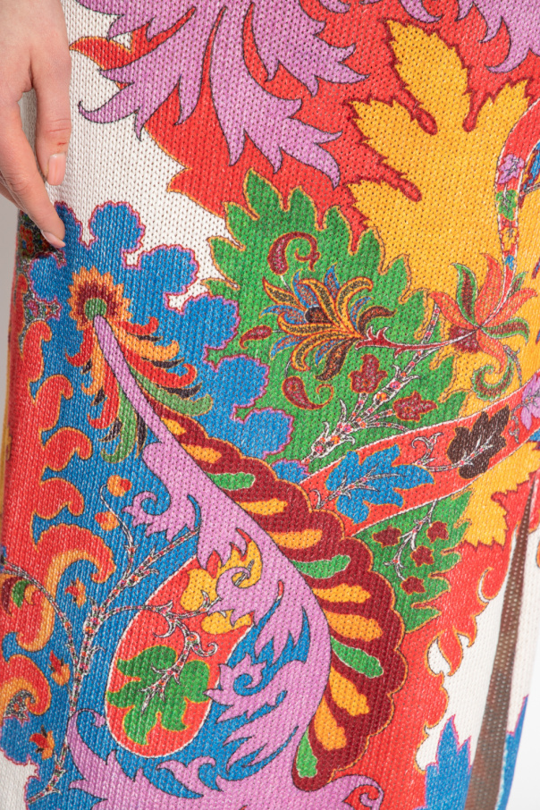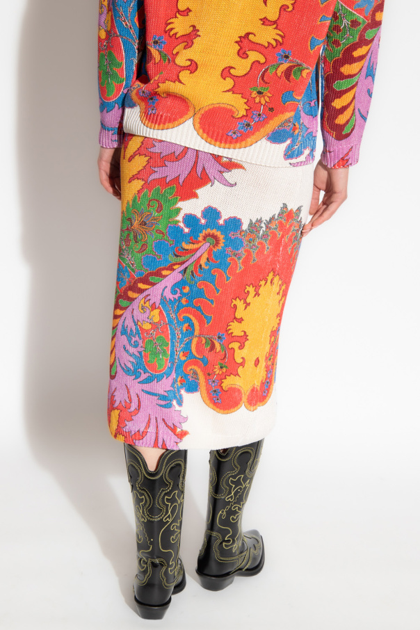 Multicoloured skirt from Etro. Crafted from a blend of silk and linen, this style showcases the brand\'s signature colourful paisley print, a bottom slit and an elasticated waistband and hem.