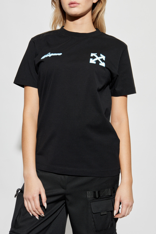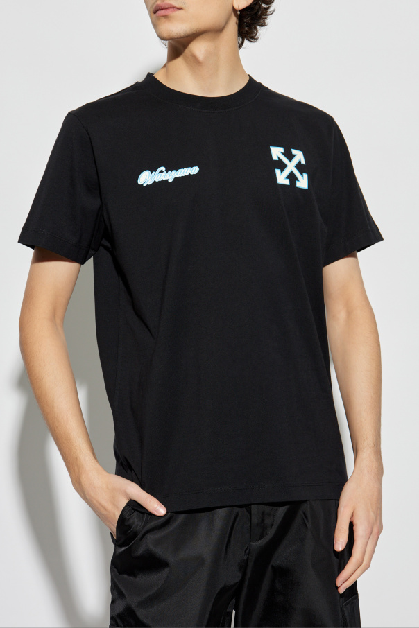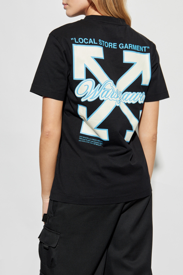 Discover the extraordinary Exclusive for DH Vitkac T-shirt from the renowned brand Off-White, founded by fashion visionary Virgil Abloh. This black unisex T-shirt with short sleeves, made from premium cotton, exudes a luxurious character and modern style. On the front of the T-shirt, on the left side, there is a subtle \"Warszawa\" inscription, and on the right, the iconic four-arrow logo, all in light blue color. The back features a large motif with the logo and \"Warszawa\" inscription, with the addition of \"LOCAL STORE GARMENT\" on top. The light blue prints create a harmonious contrast with the black background. Why buy this product? Exclusive design from the Off-White brand. Made from the highest quality cotton. Unique artistic motifs referencing Warsaw. Modern style that attracts attention.