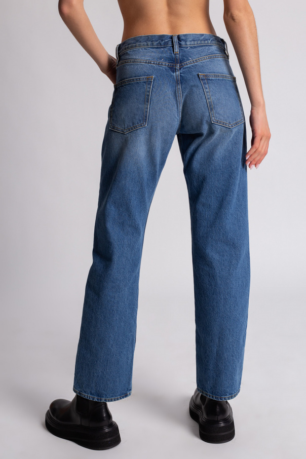 Blue distressed jeans from Maison Margiela. Fastened with buttons, this straight leg design features three front and two back pockets.