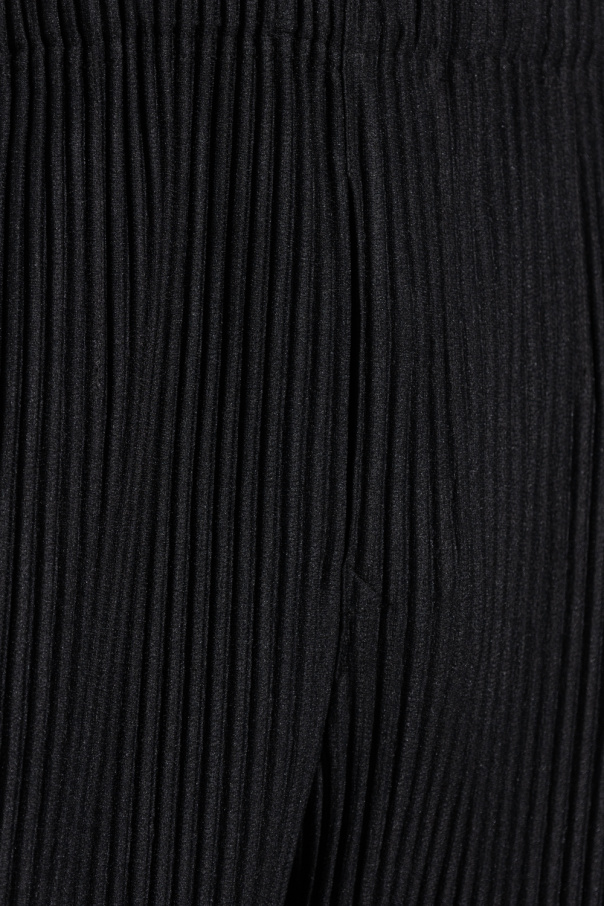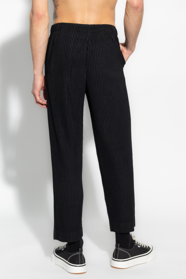 Black trousers from Issey Miyake Homme Plisse. Crafted from recycled material with the brand\'s signature pleats, this pair falls with cropped, straight legs and features a drawstring waistband and two slip pockets.