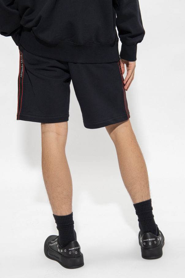 Black shorts from Alexander McQueen. Crafted from cotton, this pair features a drawstring waist, two side seam pockets, one back zip pocket and black and red side stripes with an embroidered white logo.