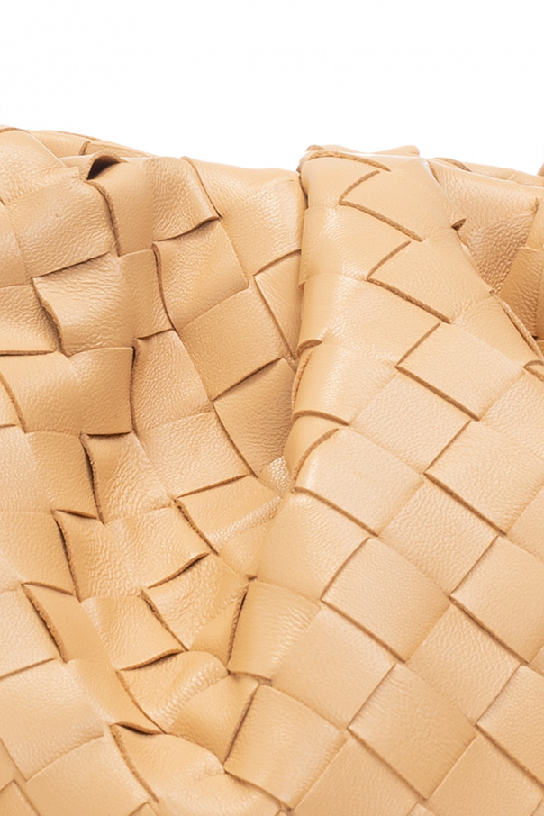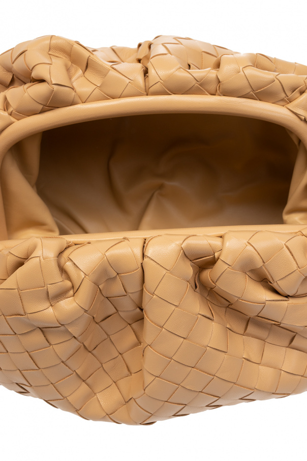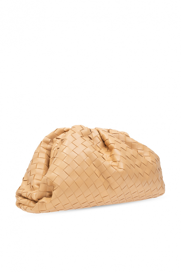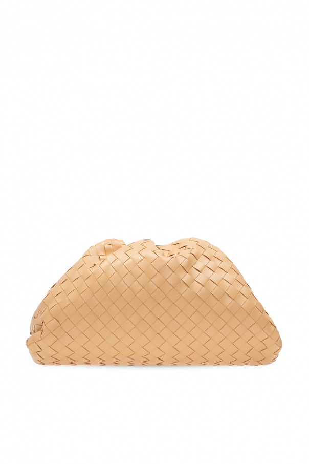 Beige ‘The Pouch’ clutch from Bottega Veneta. Size large. Crafted from lamb leather with the label's iconic Intrecciato weave, this design features magnetic snap fastenings and one internal compartment.