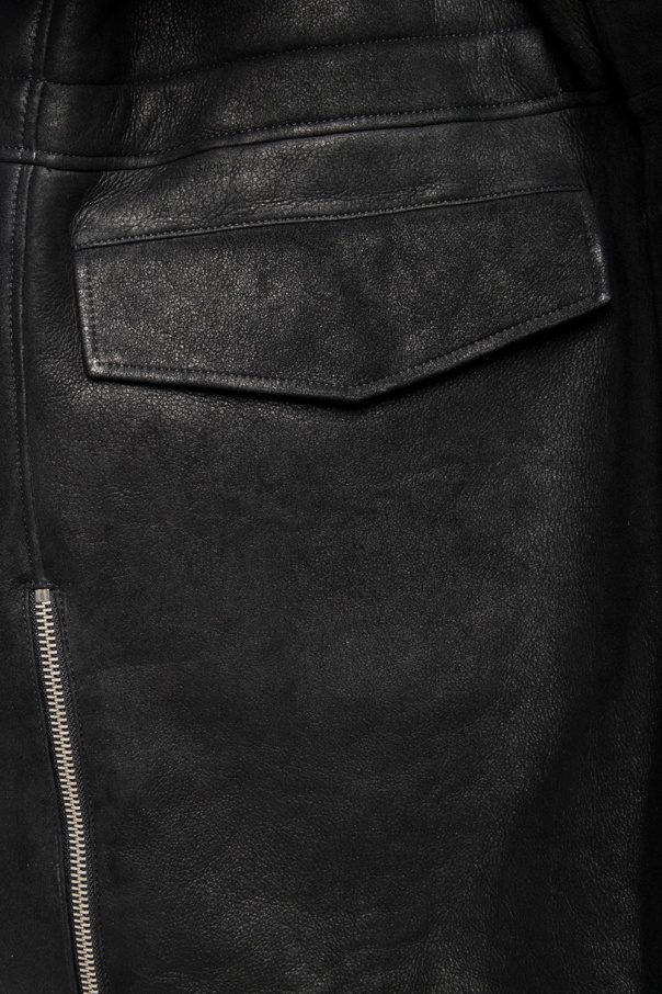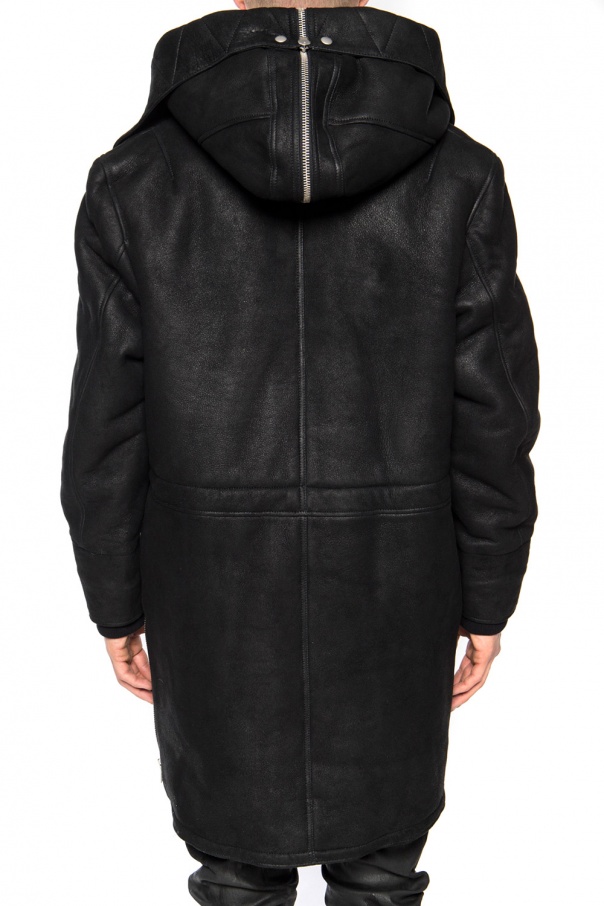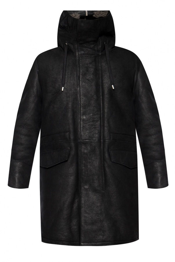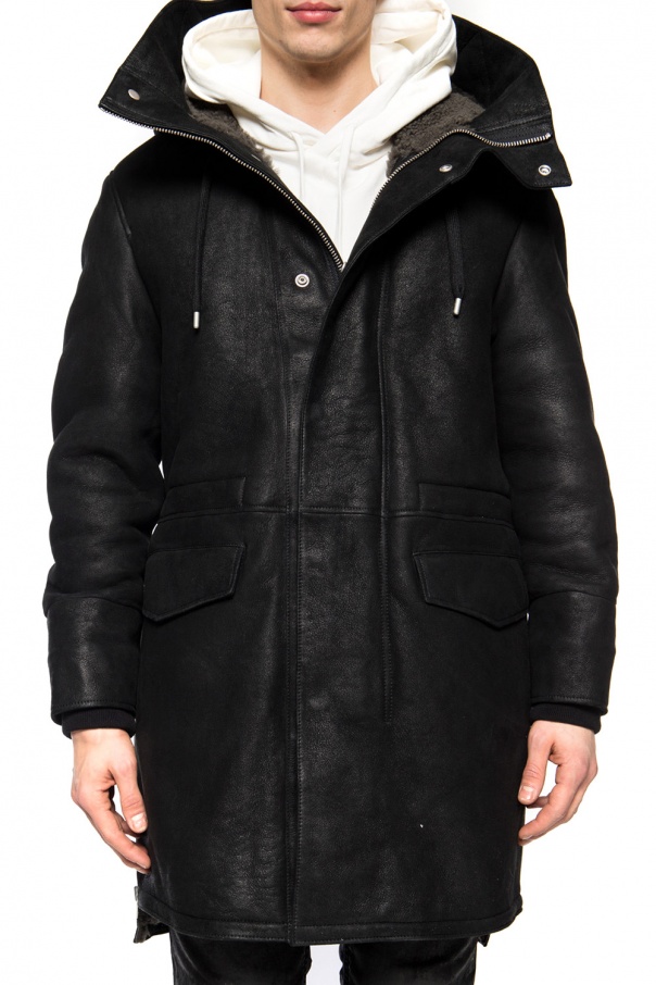 Black \'Ramac\' shearling coat from AllSaints. Made of sheepskin. Fastened via two-way zip and snap buttons with a concealed placket. Features 2 snap-fastened flap pockets on the front, hood which doubles as a wide-spread collar, zipped side vents as well as dark grey shearling lining.
