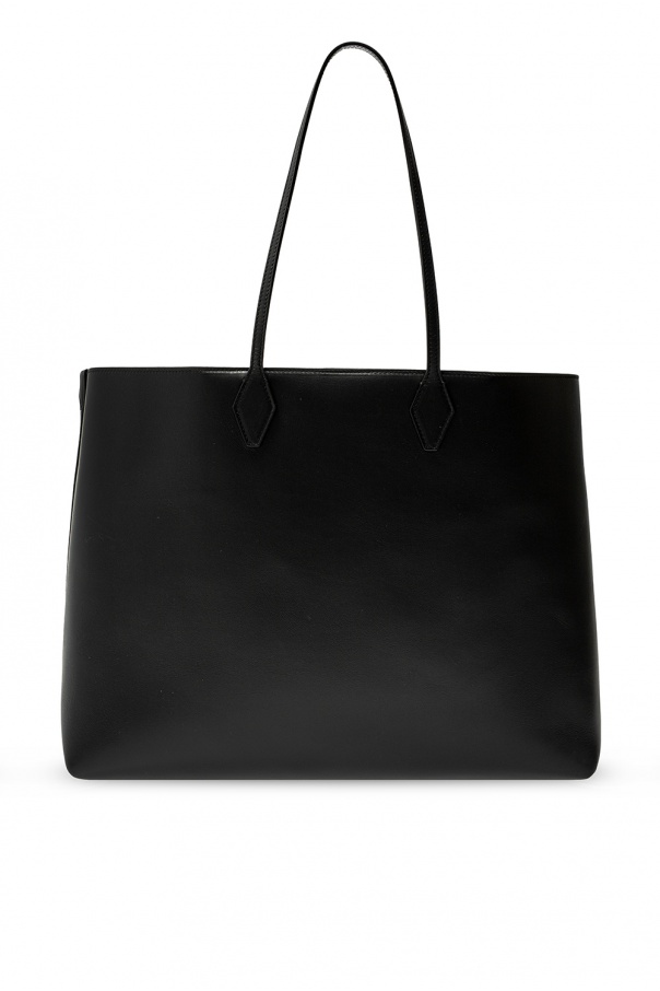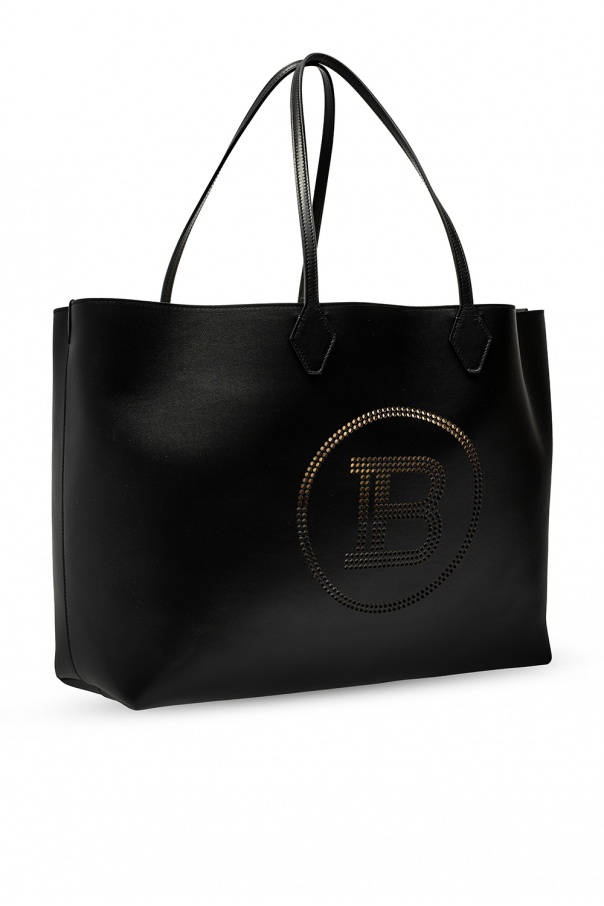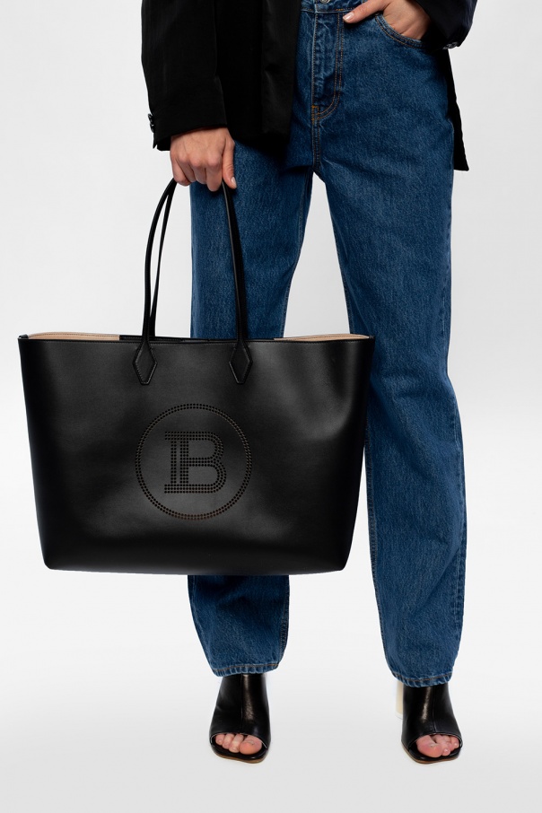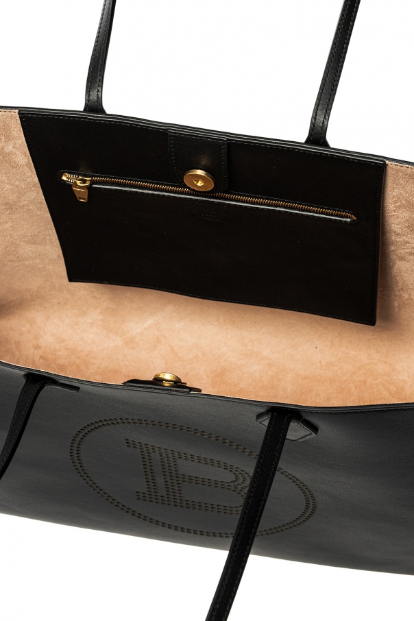 Black shopper bag from Balmain. Crafted from calf leather with bovine leather trims, this bag features a magnetic closure, perforated logo detail, two half-round handles, suede lining and one internal zip pocket.