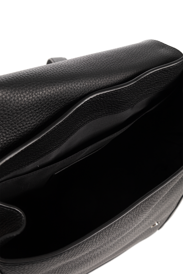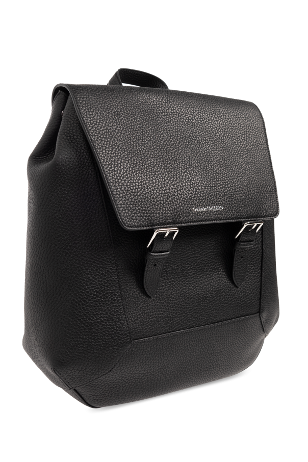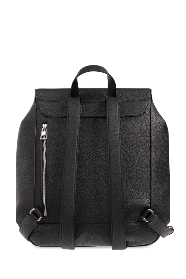 Black backpack from Alexander McQueen. Made of leather, this item features magnetic snaps, a gold-tone logo print, zipped back pocket, half-round handle, adjustable shoulder straps, silver-tone metal hardware and one internal compartment with one slip pocket.
