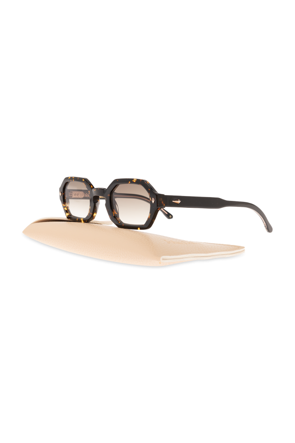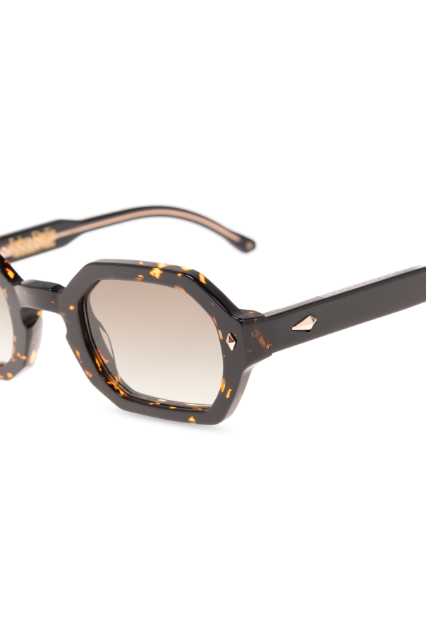 Black and orange ‘Milla’ tortoiseshell sunglasses from John Dalia. This model has an angular rectangular shape made out of a 6mm acetate plate with a single bridge and integrated nose pads and showcases metal applications on the front, black temples, a rose gold-plated framework and green gradient lenses with protection against UV rays, reflections and blue light. Comes with a case.