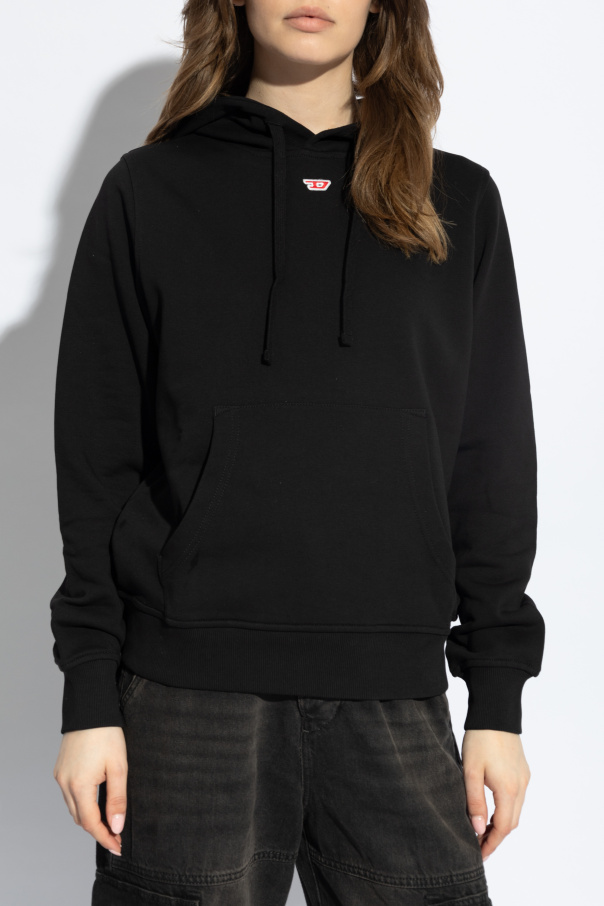 Black ‘S-GINN’ hoodie from Diesel. Made of cotton, this garment features a drawstring hood, red and white logo patch, slip pocket and ribbed trims at the hem and cuffs.