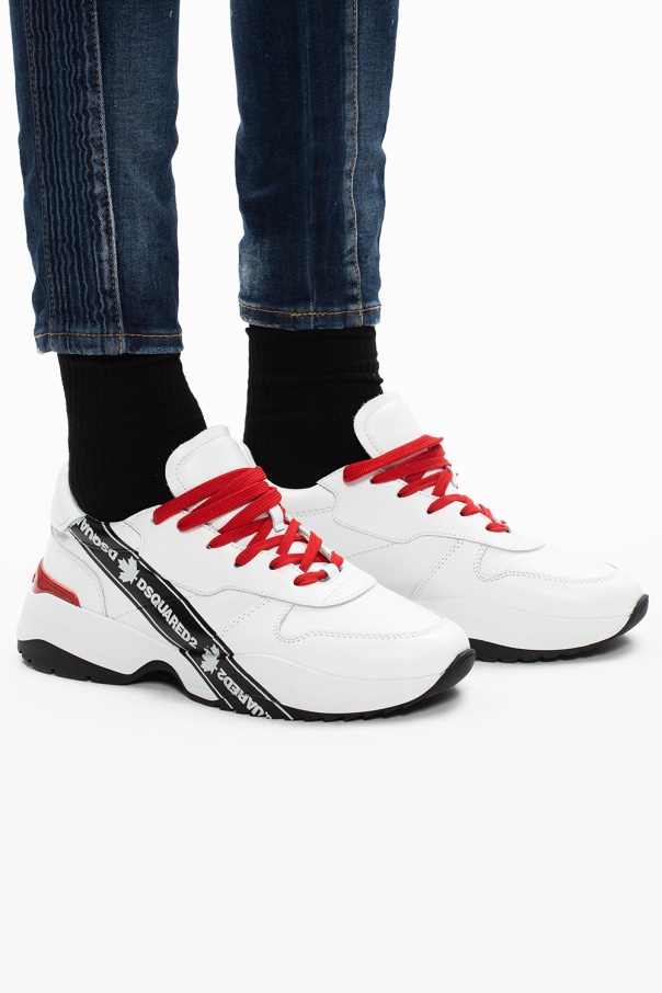 White and red ‘D24’ sneakers from Dsquared2. Showcasing black graphic print with the brand\'s logo, this lace-up pair features calf leather upper set on a white and black rubber sole.