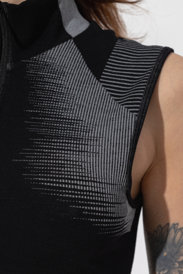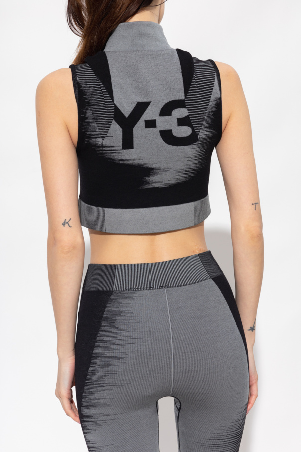 Black and grey sleeveless training top from Y-3 Yohji Yamamoto. Cut with a cropped fit, this style features a zip-up mock neck, back logo detailing and an elasticated hem.