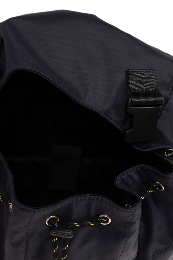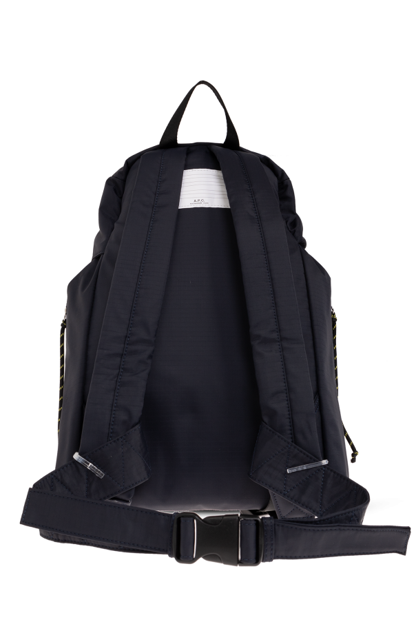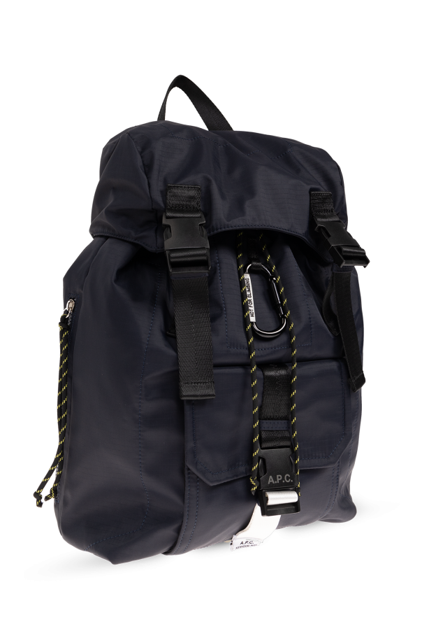 Navy ‘Treck’ backpack from A.P.C. Made of technical fabric, this design features two adjustable buckle straps, a logo, lobster clasp closure, two zip pockets, flap with a buckle strap, top handle, adjustable shoulder straps and one internal compartment with drawstrings, one slip pocket and a laptop compartment with velcro closure.
